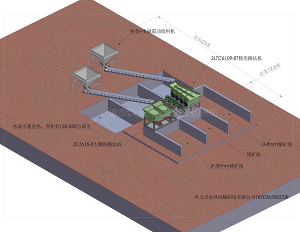 鞏義市金昌機(jī)械專業(yè)生產(chǎn)跳汰機(jī)設(shè)備,今天為大家介紹兩種常用的跳汰機(jī)設(shè)備。一種是2LTC6109-8T梯形跳汰機(jī),一種是JC1616-2大顆粒跳汰機(jī)。前者是分選0-8毫米之間的螢石礦,后者是分選8-30毫米之間的螢石礦,單臺(tái)每個(gè)小時(shí)處理量都在20-30噸之間,如果是選其它的礦物,處理量會(huì)更大一些。前者是下排料跳汰機(jī),也就是精礦從跳汰機(jī)肚子下邊出,后者是篩上排礦的跳汰機(jī),精礦和尾礦都從跳汰機(jī)上邊出。兩種跳汰機(jī)是黃金搭檔,使用的朋友也比較大,大體怎樣布局您可以參考一下下圖,希望對(duì)您有幫助。
